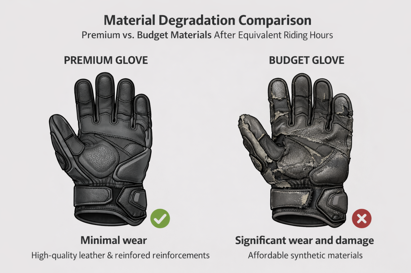 Gloves that are too tight create excessive tension on seams, while motorcycle gloves too big develop folds that rub against themselves. Both scenarios accelerate wear: